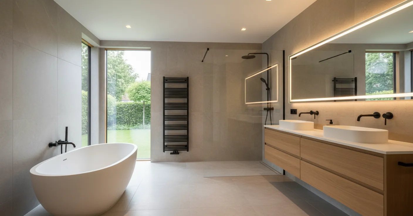 Im Obergeschoss erwarten Sie vier lichtdurchflutete Schlafzimmer, darunter das großzügige Elternschlafzimmer mit eigenem Ankleidebereich und direktem Zugang zum modernen Badezimmer mit freistehender Badewanne und bodengleicher Dusche. Ein weiteres Badezimmer steht den übrigen Schlafzimmern zur Verfügung.